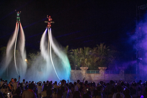 夜幕降临,如真似幻的激光水幕秀将开启令人心潮澎湃的亚特兰蒂斯水世界C浪夜场嘉年华演出,炫目的光影与动感的节奏将现场的气氛瞬间点燃。充满生命律动的非洲杂技、活力四射的巴西舞蹈,带来属于盛夏的热辣异域风情。今年更有专业MC驻场,与DJ一起将现场满溢的热情与声浪在热门金曲、舞蹈以及互动游戏中推向高潮。每周末,C浪夜场嘉年华派对还将再次升级。酷炫的水上飞人秀让人目眩神迷,表演人员驾驭飞行器时而腾空而起,时而低空疾行,身后喷射的水花一路留下飞机云般的轨迹。压轴演出将激光水幕、水上飞人、绚烂烟花结合在一起,夏夜的灿烂与激情弥漫在水世界的上空,为宾客带来无与伦比的视听盛宴。