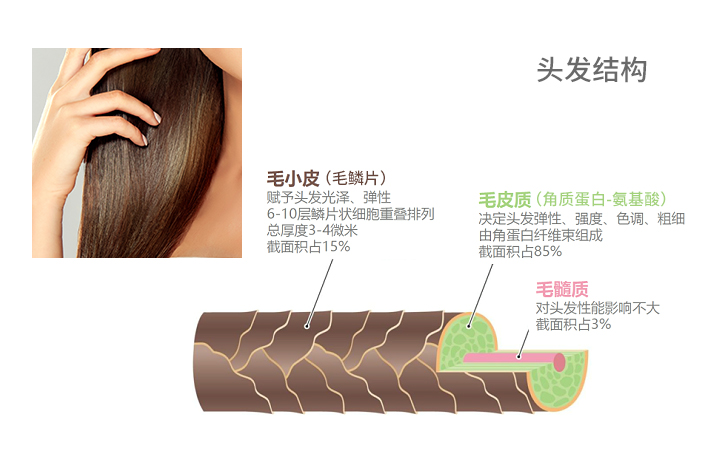 从发丝结构来看,可以看出毛皮质决定着发丝的弹性、强度、色调以及粗细,而毛皮质又主要是由角质蛋白构成,因此如果我们坚持口服胶原蛋白,也将对发丝十分有益。