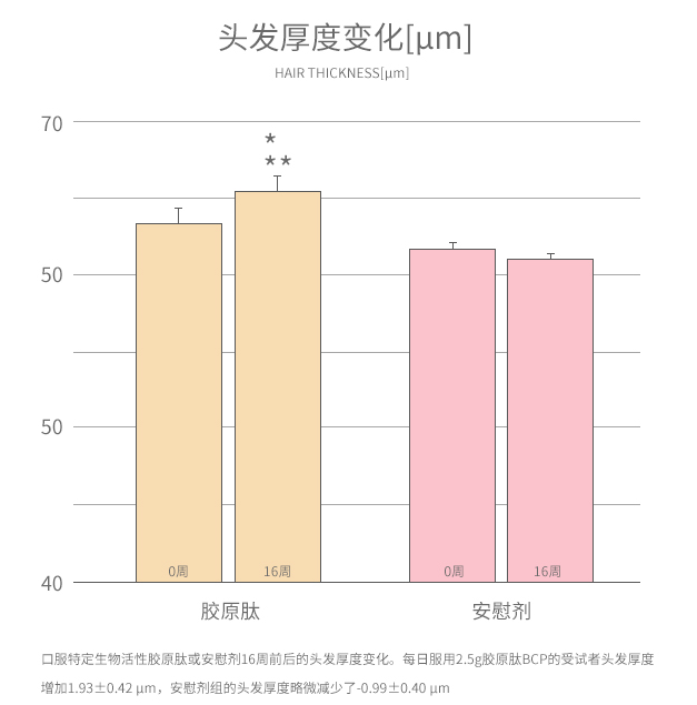 16周后,胶原肽组的头发厚度增加了1.93±0.42 µm,而安慰剂组的头发因没有补充进充足的胶原蛋白,依然处于脱落状态,16后厚度减少了-0.99±0.40 µm。