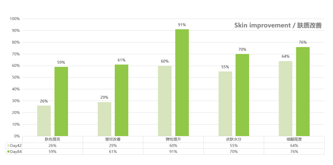84Ììºó£¬·ôÉ«ÌáÁÁ59%¡¢ÖåÎÆ¸ÄÉÆ61%¡¢µ¯ÐÔÌáÉý91%¡¢Ë®·ÖÔö¼Ó70%¡¢Æ¤·ôϸÄå³Ì¶ÈÌá¸ßµ½76%¡£²»½ö½öÊÇÃÀ°×£¬·ôÖÊÒ²µÃµ½ÁËÈ«·½Î»µÄ¸ÄÉÆ¡£