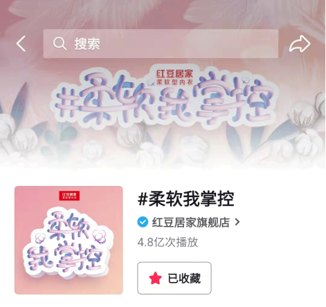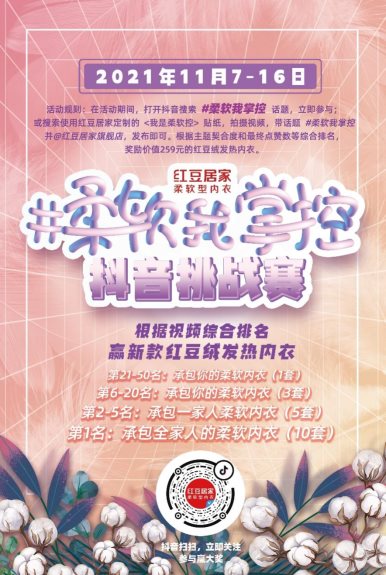 在消费升级的热潮下,抖音日活用户数突破6.5亿。随着短视频的崛起,各大品牌纷纷转移阵地,聚焦短视频平台,借势短视频平台致力打造品牌新爆点。对于更注重线下穿着体验的内衣品类来说,如何在短视频平台锁定目标人群创造高话题性的内容、收获高人气,是内衣品类进军抖音的一大挑战。最近,柔软型内衣的倡导者红豆居家联手抖音发起了#柔软我掌控 抖音短视频挑战赛,凭借其超高热度瞬间席卷内衣行业圈,给行业做了一个不错的示范。