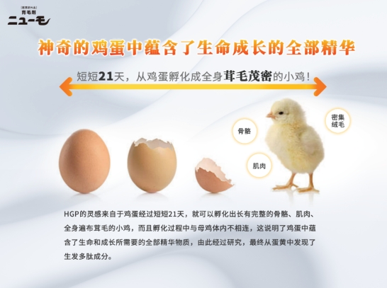 一款诞生于日本,目前累计销量超过1200万瓶的受到全球用户肯定的育发精华已经登陆中国。Newmo育发精华中含有独家专利成分HGP(生发多肽),该专利成分的灵感来自于我们日常可见的鸡蛋。科研人员发现,鸡蛋经21天就可孵化出全身布满绒毛的小鸡,说明鸡蛋中蕴含了强大的孕育生命和生长所需的活性精华物质。