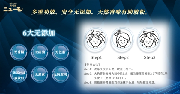 为配合达到更好的育发生发的效果,除了独家专利成分之外,Newmo育发精华中还添加了3种活性成分。而且产品更是做到了无香精、无硅油、无色素、无矿物油、无紫外线吸收剂、无防腐剂,6大无添加。