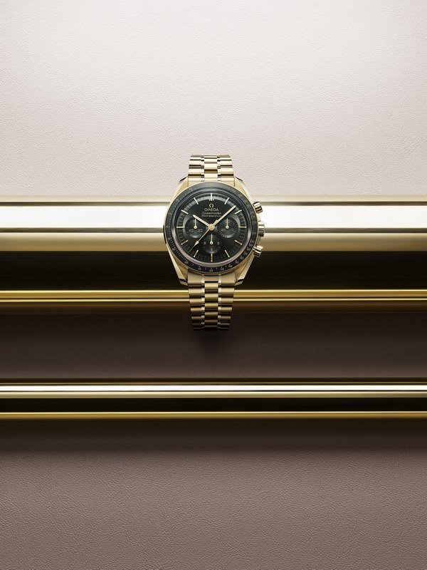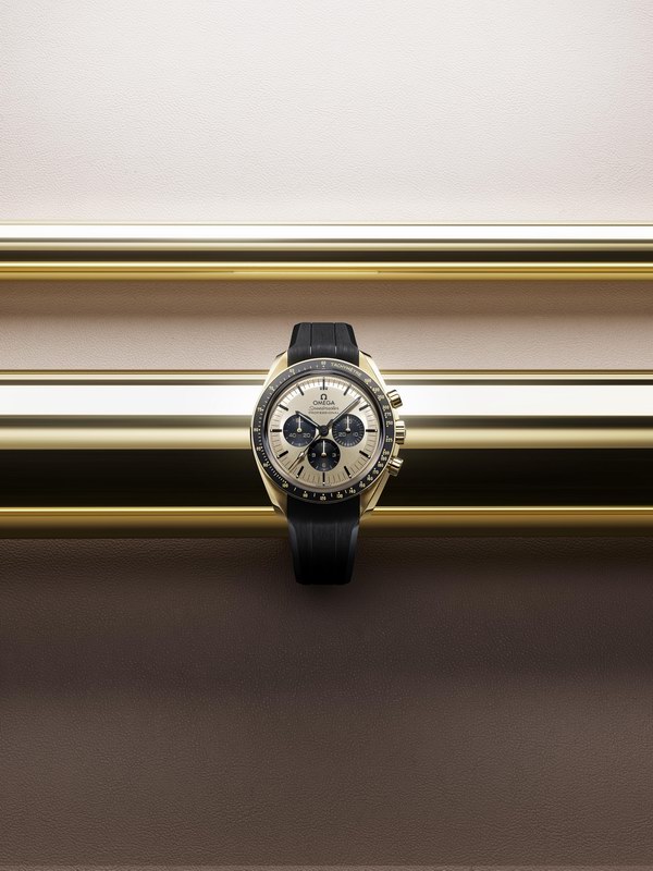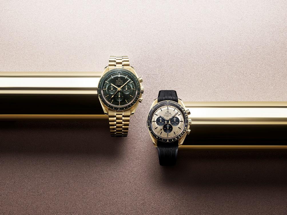 ÆäÖÐÒ»¿î“½×ÌÝʽ”±íÅ̲ÉÓÃMoonshine 18K½ðÖÆ³É£¬³ÊÏÖÌ«ÑôÉäÏß´òĥЧ¹û¡£ºÚÉ«ÌմɱíȦÉϵIJâËٿ̶ÈÓÉOMEGA Ceragold ¼¼ÊõÖÆ³É£¬²¢ÉèÓÐÔçÆÚ³¬°Ô±í¿îµÄ“Dot Over Ninety” (DON£¬¿Ì¶È90µÄÔ²µãλÓÚÊý×ÖÉÏ·½) ±êÖ¾¡£Moonshine 18K½ðС±íÅ̸²ÒÔºÚÉ«£¬½ðÖʵÄʱÕëºÍ·ÖÕëÒྺÚÉ«PVD´¦Àí¡£