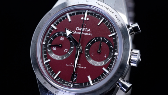 而如果说你很喜欢哑光色颗粒状的盘面效果,我个人觉得这枚勃艮第红盘面可能更加适合你。这两年类似的酒红色盘面腕表是越来越多了,而且大多数都采用的是勃艮第红,只不过有不同的处理方式。这种颜色的盘面和制作在欧米茄过去的超霸系列腕表中也是非常罕见的。