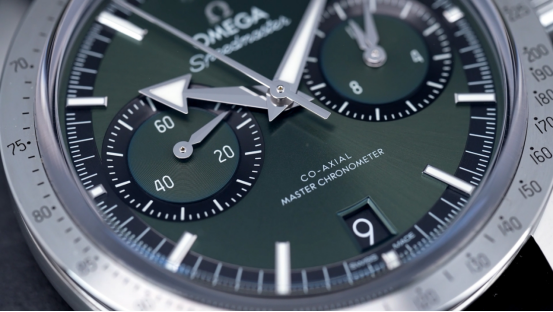 但如果说你还是比较喜欢传统风格的放射状太阳纹,其实欧米茄超霸'57的另外两个配色可以看一看,一个是蓝色,一个是绿色,这个绿色其实蛮有意思的,粗看是有点偏灰绿的感觉,但因为它采用放射纹,所以说在阳光下照耀会让人觉得眼前一亮,颜色在蓝色和绿色之间。我个人觉得这两年腕表很流行绿色,而它不是很刺眼的绿色,而是带有一些深邃感的绿。我个人觉得这个盘面的颜色更适合一些平时相对低调或文艺范、小清新范的人。