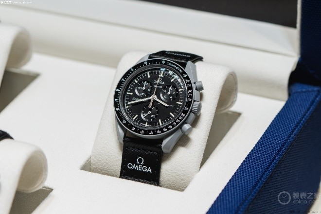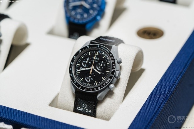 我们可以看到,箱子里装有11只“Moonswatch Moonshine gold”腕表,这11只腕表的计时秒针均镀有欧米茄独家研发的Moonshine 18K金,这也是这一些列腕表最大的特征。我们可以看到11只腕表里的10款腕表都呈黑灰色,乍看都一样,但仔细看的话每款腕表的Moonshine 18K金计时秒针都有着不一样的细节,比如这款于2023年7月发售的腕表的计时秒针上饰有草莓图案,是在草莓满月期间制作,本草莓脑袋表示简直太可爱了。